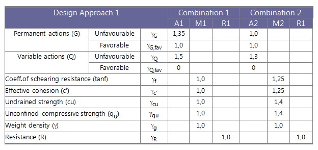 NOTE 1 In Combination 1, partial factors are applied to actions and to ground strength parameters. In Combination 2, partial factors are applied to actions, to ground resistances and sometimes to ground strength parameters.